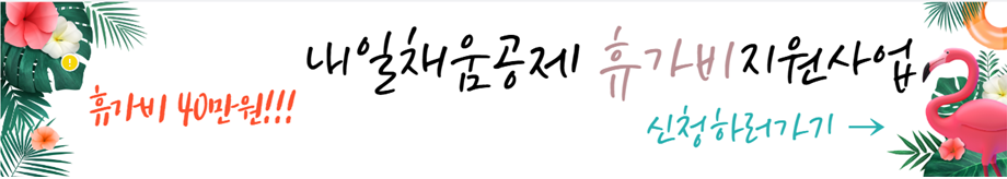 내일채움공제 휴가비지원사업은 중소기업 장기 재직 장려와 건전한 휴가 문화 조성을 위해 중소벤처기업진흥공단과 한국관광공사가 함께 진행하는 복지 프로그램입니다. 내일채움공제 또는 청년내일채움공제 가입 근로자를 대상으로, 근로자 자부담 20만 원 + 정부 지원 20만 원을 합산해 총 40만 원의 휴가 포인트를 제공합니다. 조건되시는 분들은 빠짐없이 바로 신청하시기 바랍니다~!!!
